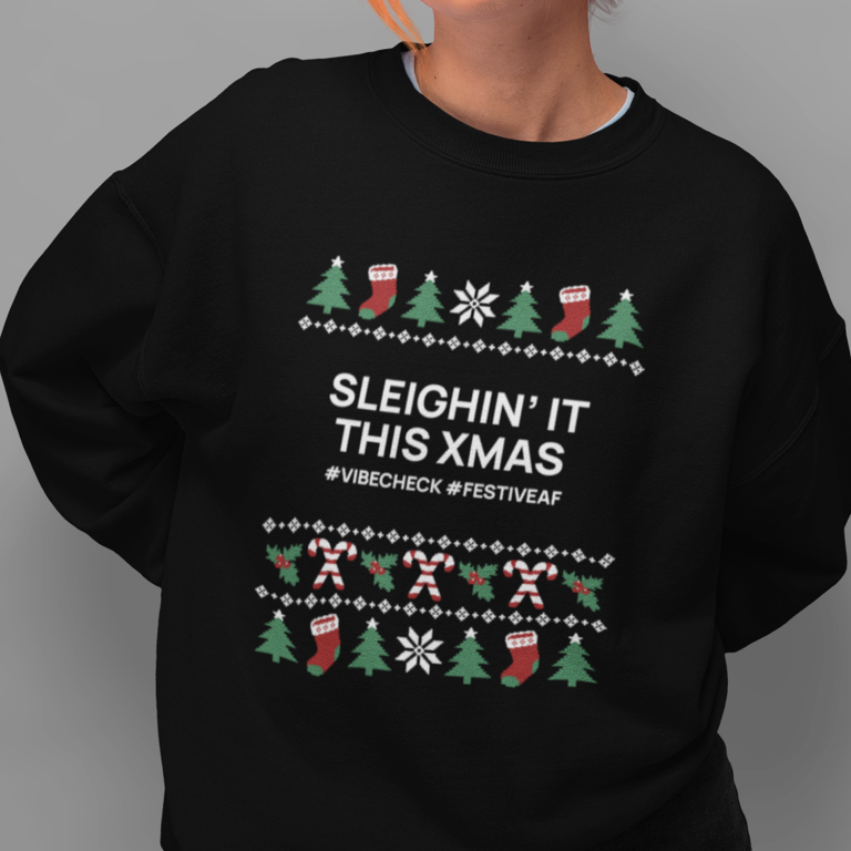 Gen Z Kerst Sweater Zwart Sleighin' It This Xmas #Vibecheck #FestiveAF