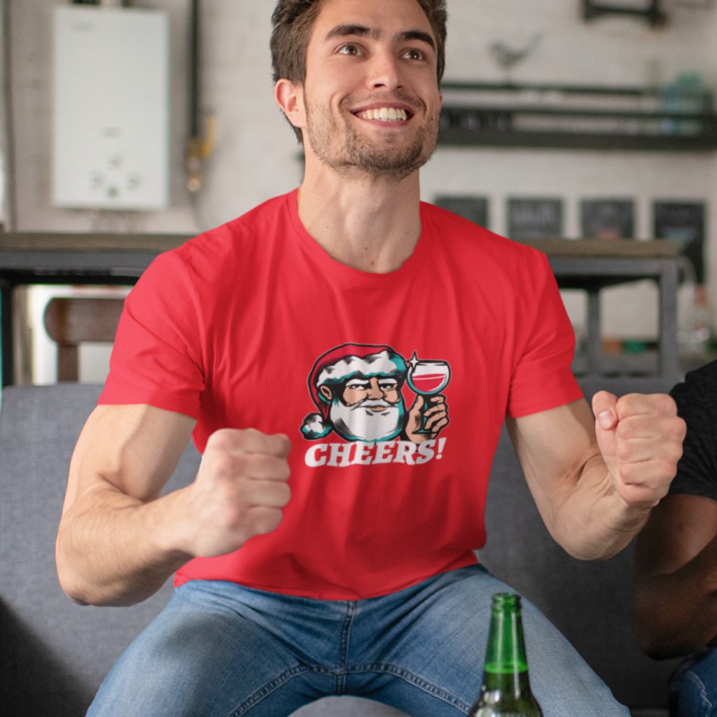 Dit foute kerst t-shirt met de tekst Cheers is rood van kleur en heeft een full-color borstopdruk! Dit unieke model is alleen verkrijgbaar bij 1001Caps. Het design is speciaal voor iedereen die van een drankje houdt en een gezonde dosis humor bezit. Dit is één van onze populairste foute kerst t-shirts die het ieder jaar weer goed doet. Dames kiezen uit maat XS t/m 3XL en heren hebben de keuze uit maat XS t/m 5XL. Bekijk de maattabellen onderaan de pagina voor de perfecte fit!