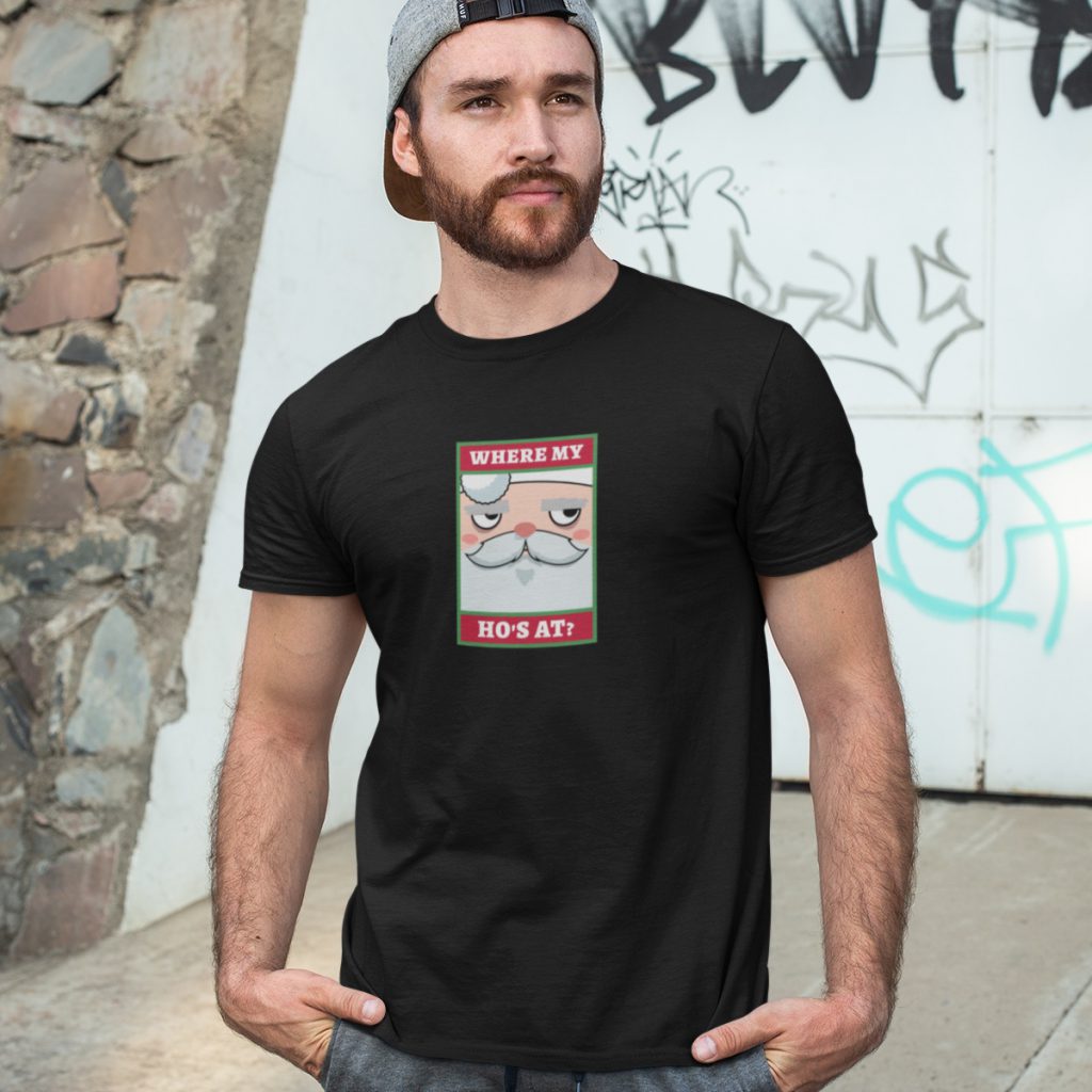 Dit foute kerst t-shirt met Where My Ho's At is exclusief te bestellen bij 1001Caps! Het is een zeer gewild exemplaar tijdens de feestdagen door de opvallende full-color print op de borst. Je kunt kiezen uit een dames- of een herenpasvorm, voor het optimale draagcomfort. Dames kiezen uit de maten XS t/m 3XL en heren hebben de keuze uit maat XS t/m 5XL. Bekijk de maattabellen onderaan de pagina voor de perfecte fit!