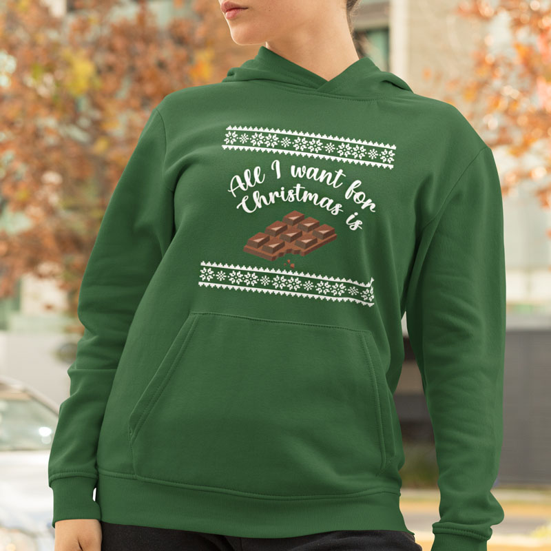 Deze foute kerst Hoodie met de tekst All I Want for Christmas is Chocola is de ultieme kersthit voor chocoladeliefhebbers. Warm, grappig en ideaal voor ieder kerstfeest.