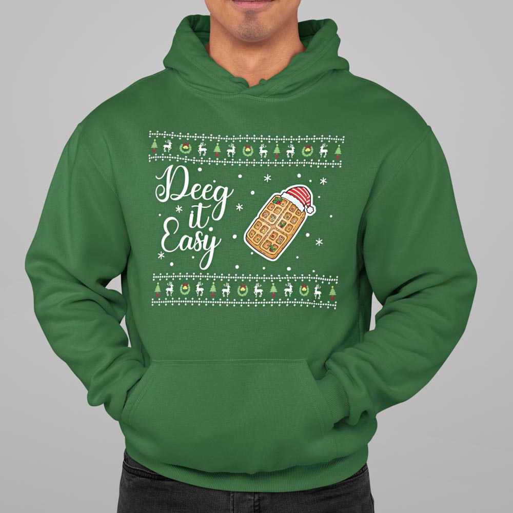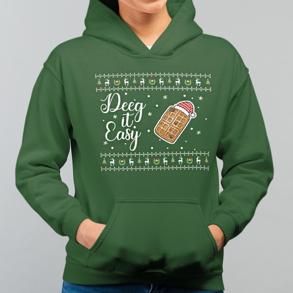 Deze foute kerst hoodie met de tekst “Deeg It Easy” is een knipoog naar de onweerstaanbare Belgische wafel. Een perfecte mix van winterse gezelligheid en zoete humor! De hoodie is heerlijk warm en zacht, ideaal voor kerstborrels, foute kerst hoodie feestjes of gewoon om thuis in te genieten met een warme chocomelk. Een geweldig cadeau voor iedereen die houdt van kerst én wafels.