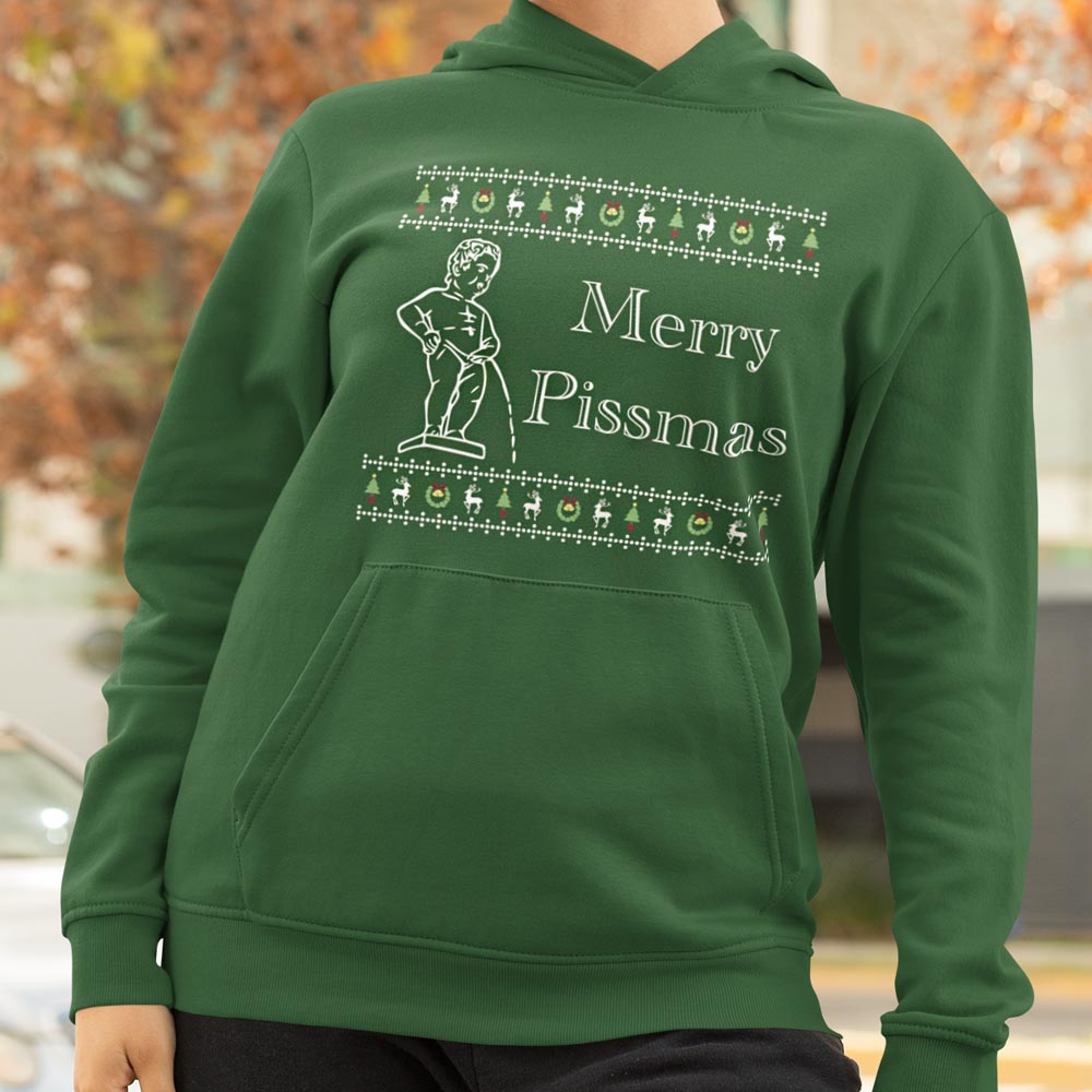 Vier kerst op z’n Brussels met de ondeugende kerst hoodie "Merry Pissmis"! Deze hoodie verwijst op speelse wijze naar Manneken Pis, hét symbool van Belgische humor. Ideaal voor foute kerstfeestjes, gezellige borrels of als originele cadeautip. Comfortabel, warm en gegarandeerd goed voor lachsalvo’s!