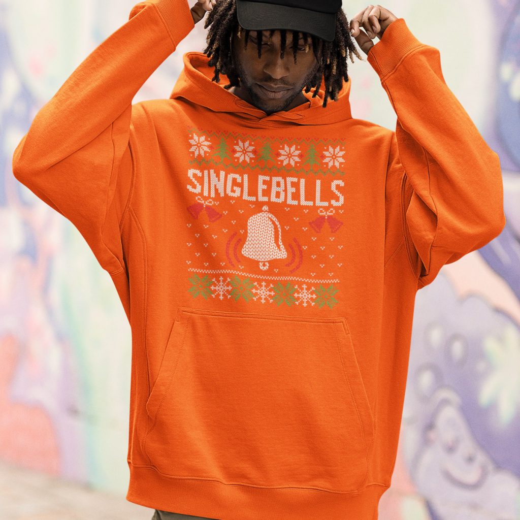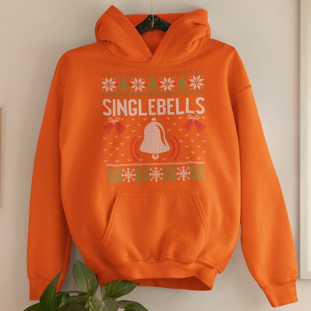 De oranje kerst hoodie met Singlebells is voor alle openlijke vrijgezellen tijdens Kerstmis. Het heeft een uniseks fit en is dus geschikt voor zowel dames als heren. Deze kerstsweater is verkrijgbaar in de maten XS t/m 4XL.