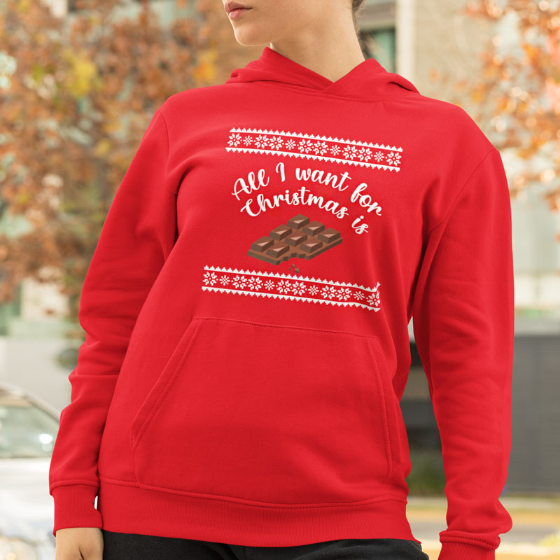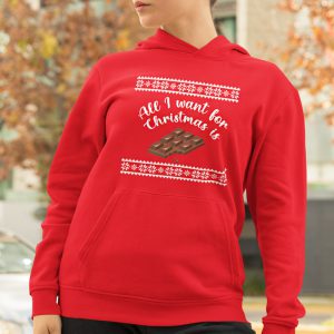 Deze foute kerst Hoodie met de tekst All I Want for Christmas is Chocola is de ultieme kersthit voor chocoladeliefhebbers. Warm, grappig en ideaal voor ieder kerstfeest.
