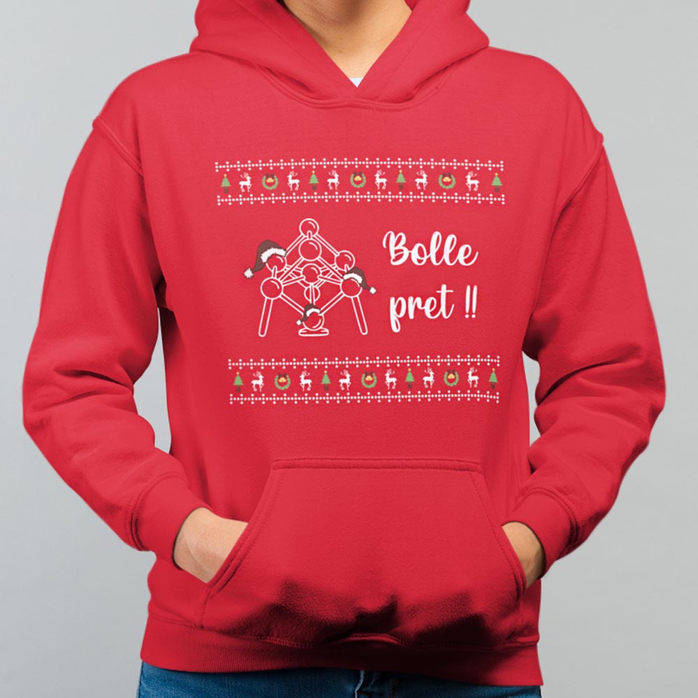 Breng wat Belgische humor in je kerstoutfit met deze gezellige kerst hoodie "Bolle Pret!". De hoodie toont het beroemde Atomium in feestelijke kerststijl, ideaal voor foute kerstfeestjes, familiediners of gewoon een warme winterdag. Comfortabel, zacht en 100% feestproof!