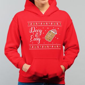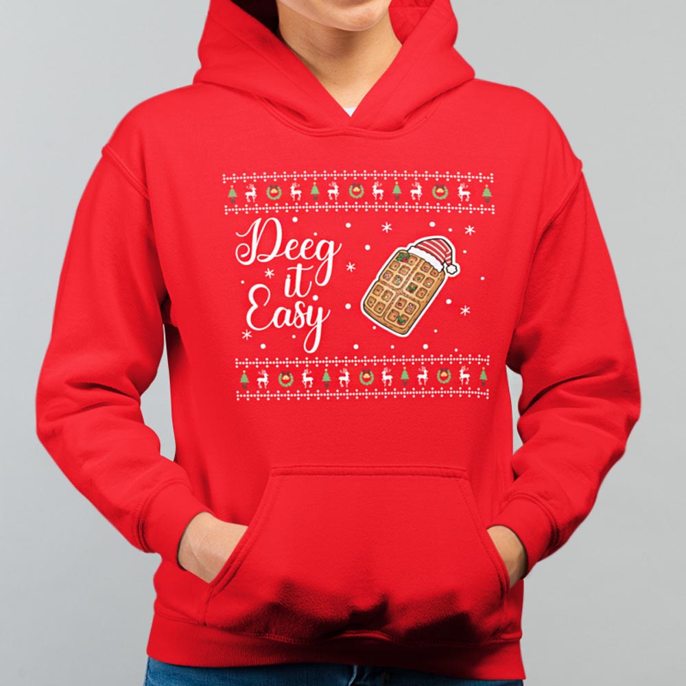 Deze foute kerst hoodie met de tekst “Deeg It Easy” is een knipoog naar de onweerstaanbare Belgische wafel. Een perfecte mix van winterse gezelligheid en zoete humor! De hoodie is heerlijk warm en zacht, ideaal voor kerstborrels, foute kerst hoodie feestjes of gewoon om thuis in te genieten met een warme chocomelk. Een geweldig cadeau voor iedereen die houdt van kerst én wafels.