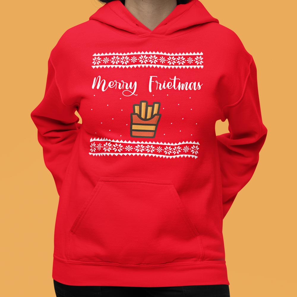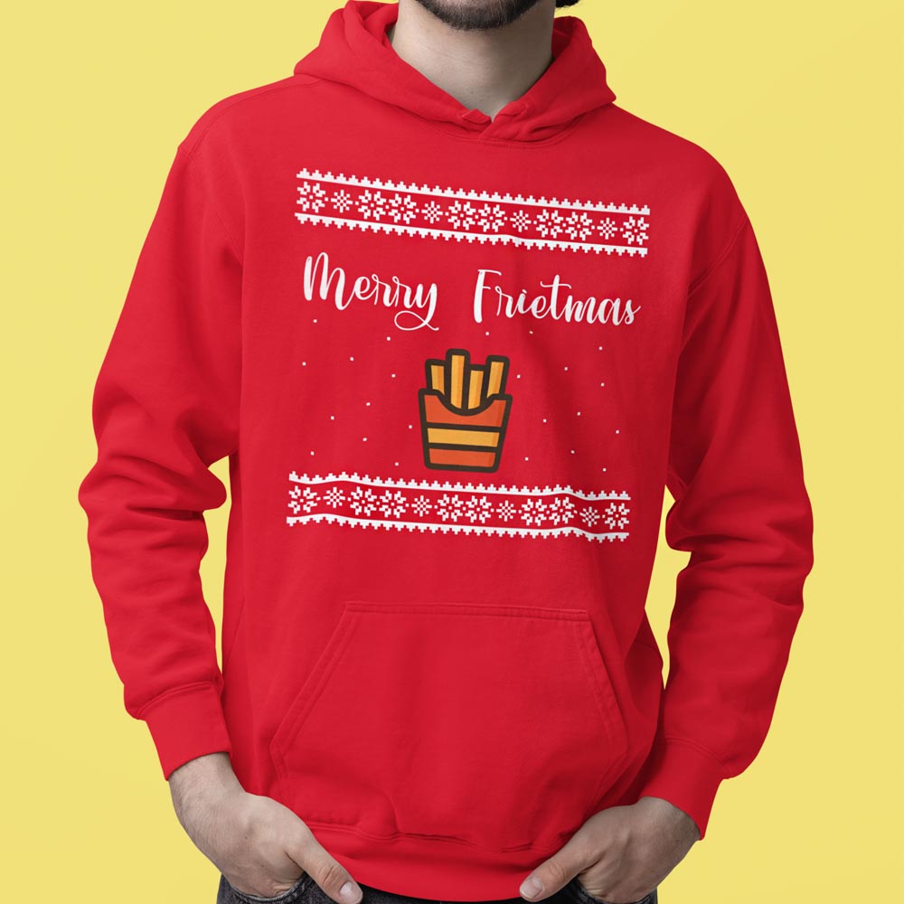 Foute Kerst Hoodie Rood "Merry Frietmas"