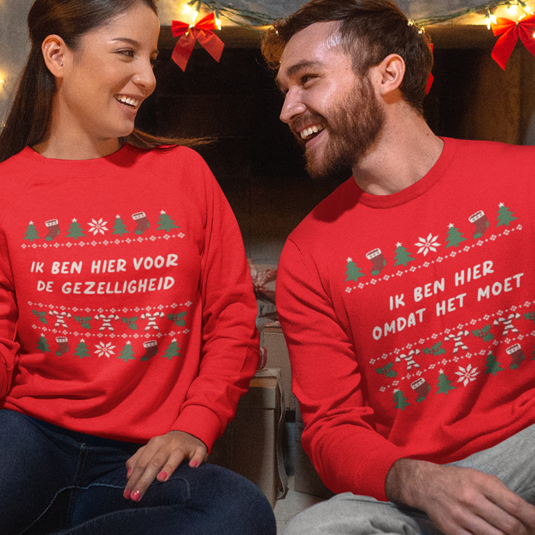 Koppel Kerst Sweaters Rood Ik Ben Hier Voor De Gezelligheid | Ik Ben Hier Omdat Het Moet - Candy Cane