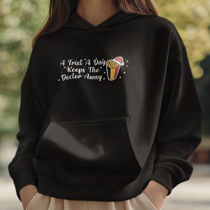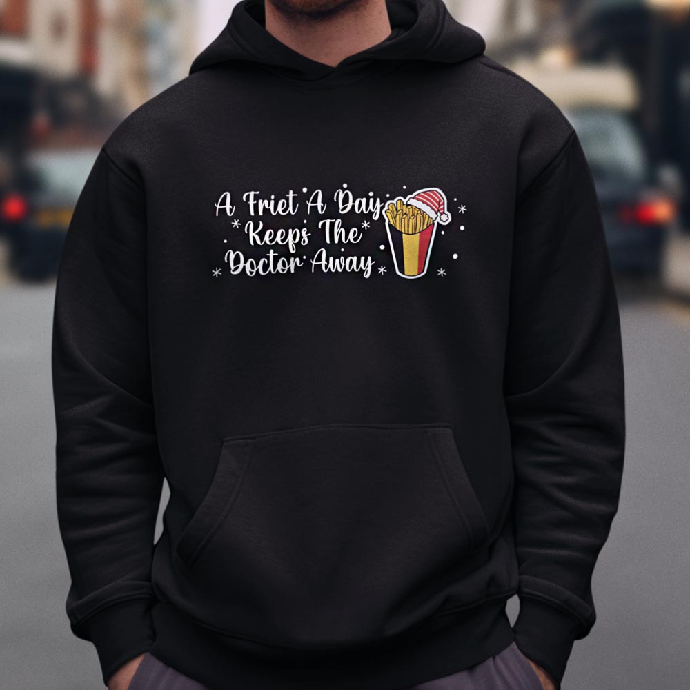 Deze foute kerst hoodie met de tekst “A Friet A Day Keeps the Doctor Away” is een zalige keuze voor iedereen die dol is op Belgische frietjes. Warm, zacht en heerlijk fout: de ideale outfit voor kerstborrels en familiefeesten. Perfect als grappig cadeautje voor een echte friet-fan of om zelf te dragen met een portie goudgele heerlijkheid in de hand.