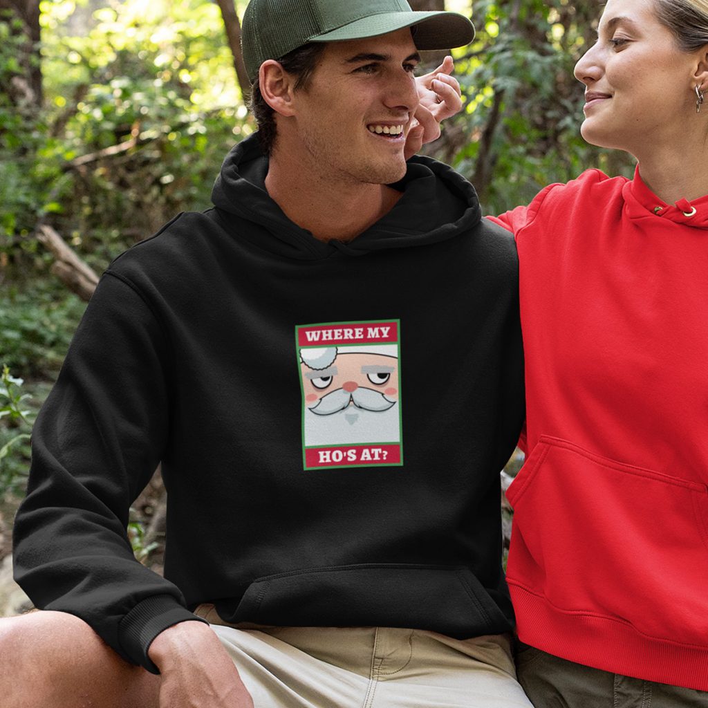Als je wel van een schunnig grapje houdt, dan is deze zwarte kerst hoodie met Where My Ho's At de perfecte foute kersttrui voor jou! Het is een comfortabele, uniseks hoodie sweater die geschikt is voor zowel dames als heren. Dit unieke design is alleen te verkrijgen bij 1001Caps en leverbaar in de maten XS t/m 5XL.
