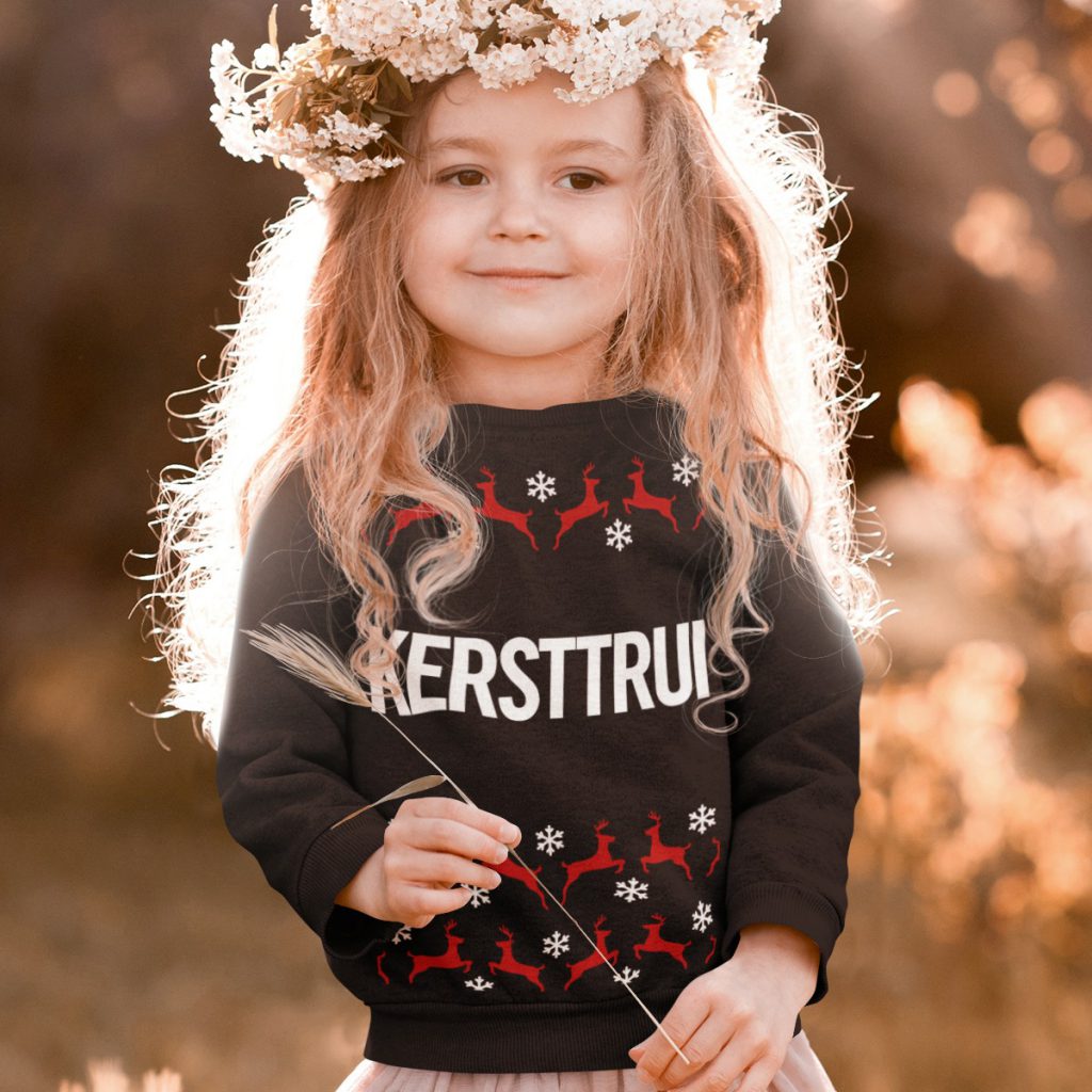 Met deze zwarte foute kersttrui voor kinderen komt jouw zoon of dochter stijlvol voor de dag! Het draagt de tekst "Kersttrui" op de borst, tezamen met een patroon van rendieren en sneeuwvlokken. De sweater is geschikt voor kinderen van 3 t/m 14 jaar, zowel voor jongens als meisjes. Verkrijgbaar in 5 maten en heeft een comfortabele pasvorm.
