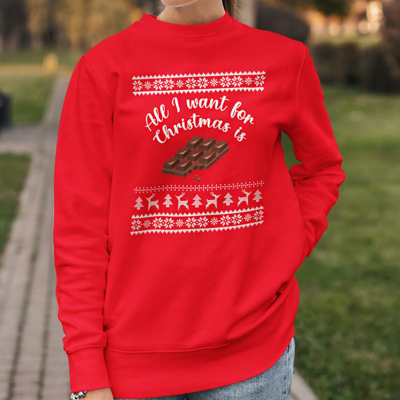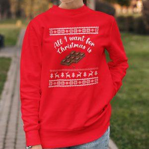 Deze foute kersttrui met de tekst All I Want for Christmas is Chocola is de ultieme kersthit voor chocoladeliefhebbers. Warm, grappig en ideaal voor ieder kerstfeest.