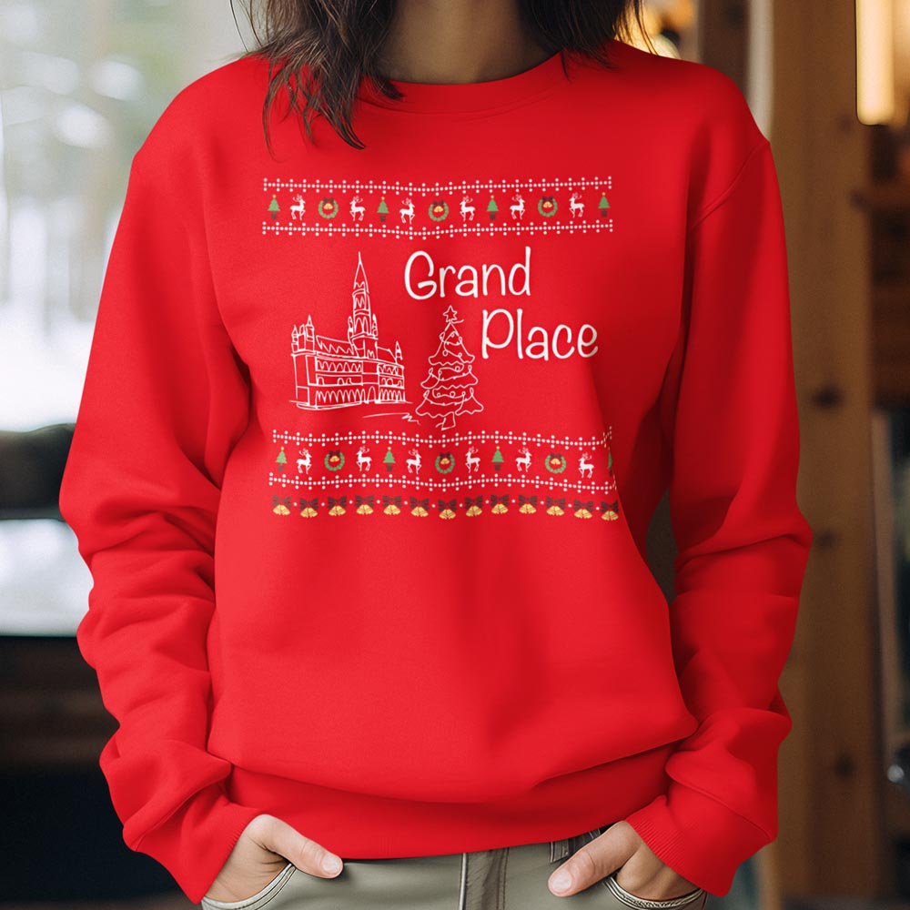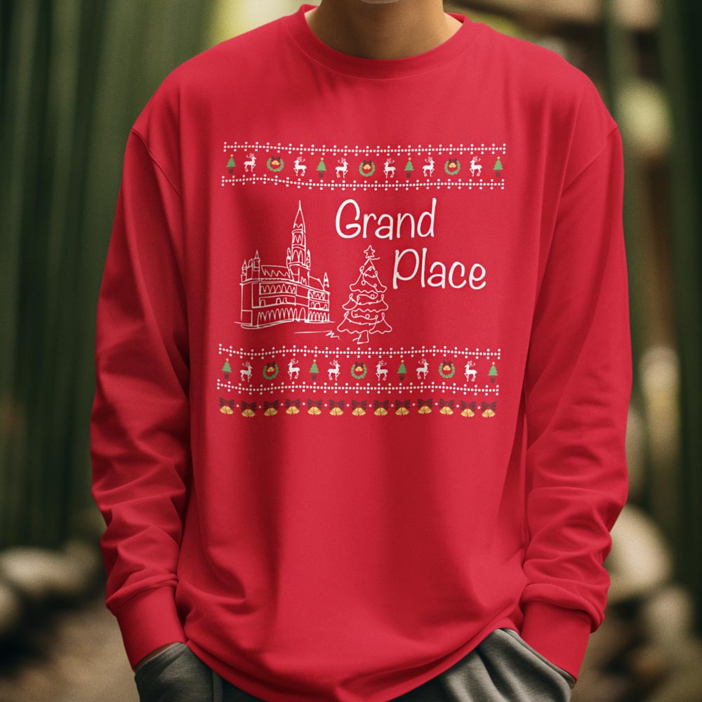 Laat je liefde voor Brussel zien met deze unieke kersttrui "Grand Place"! De trui toont de betoverende kerstcharme van de beroemde Brusselse Grote Markt in feestelijke stijl. Perfect voor foute kerstfeestjes, wintermarkten of knusse avonden bij de haard. Comfortabel, warm en 100% Belgisch plezier!