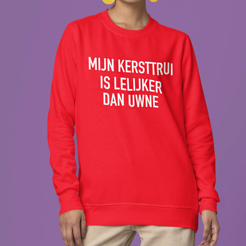 De foute kersttrui Mijn kersttrui is lelijker dan uwne is dé blikvanger van elk kerstfeest. Heerlijk zacht, warm en vol kerstsfeer, precies zoals een échte lelijke kersttrui hoort te zijn. Ideaal voor foute kerstfeestjes, familie-etentjes of als ludiek cadeau voor vrienden. Draag hem met trots en bewijs dat jouw trui écht de lelijkste is!