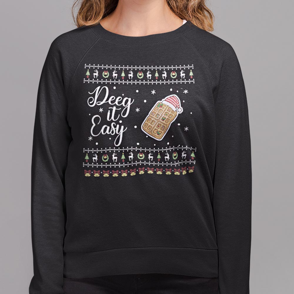 Deze foute kersttrui met de tekst “Deeg It Easy” is een knipoog naar de onweerstaanbare Belgische wafel. Een perfecte mix van winterse gezelligheid en zoete humor! De trui is heerlijk warm en zacht, ideaal voor kerstborrels, foute kersttruienfeestjes of gewoon om thuis in te genieten met een warme chocomelk. Een geweldig cadeau voor iedereen die houdt van kerst én wafels.