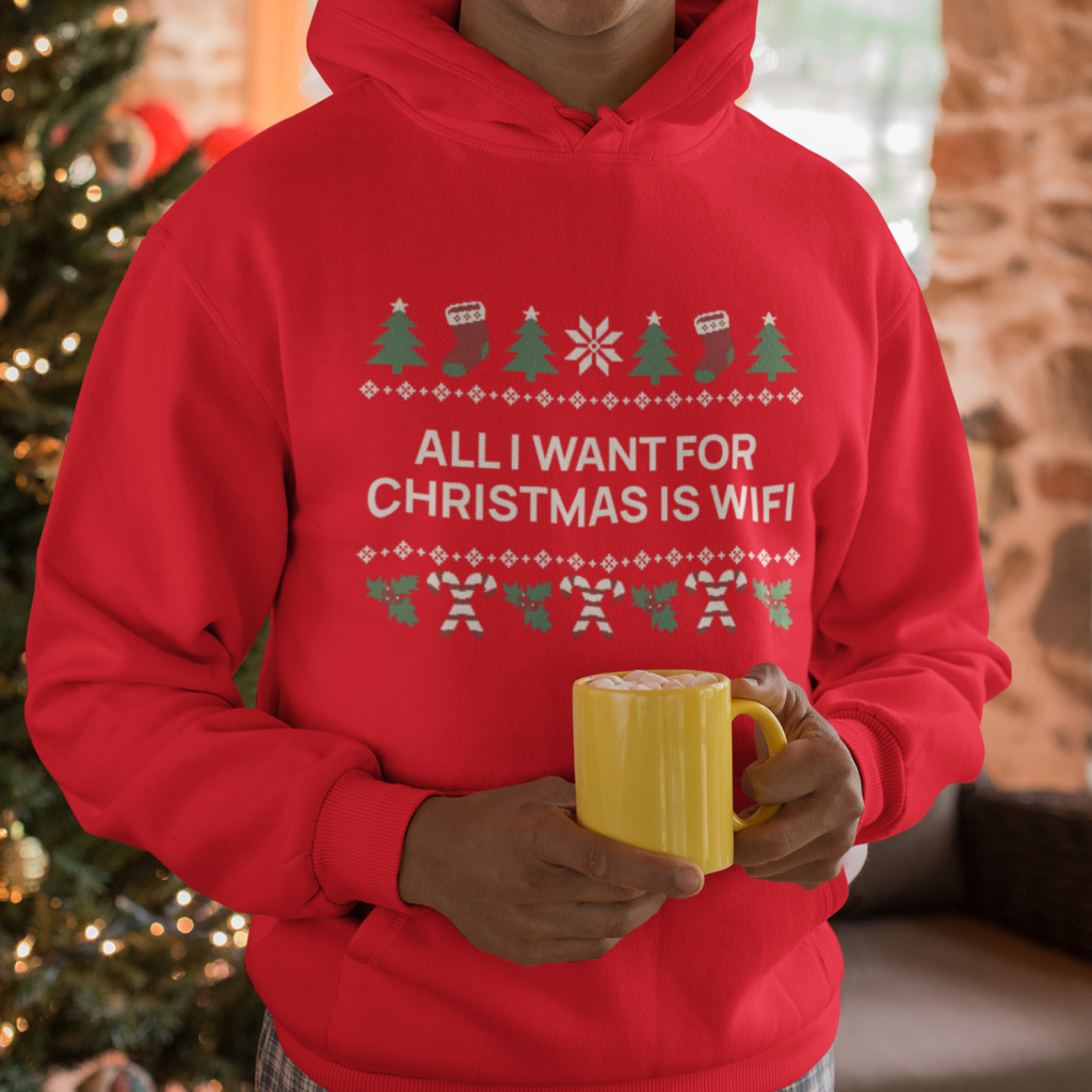 Gen Z Kerst Hoodie Rood All I Want For Christmas Is WiFi