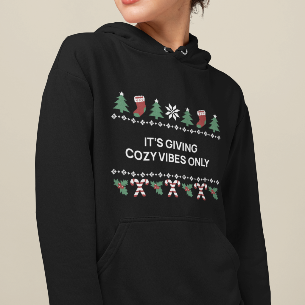 Gen Z Kerst Hoodie Zwart It's Giving Cozy Vibes Only