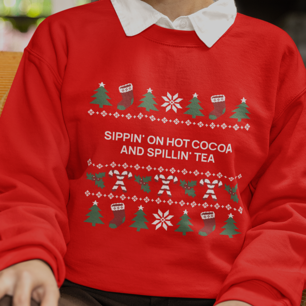 Gen Z Kerst Sweater Rood Sippin' On Hot Cocoa And Spillin' Tea
