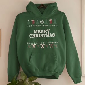 Deze feestelijke groene kerst hoodie met Merry Christmas heeft een hip patroon met verschillende afbeeldingen! Als je goed kijkt zie je allemaal kerstbomen, kerstsokken, zuurstokken en zelfs hulst afgebeeld op de comfortabele kerstsweater. Door de uniseks fit is deze geschikt voor dames en heren. De foute kersttrui is verkrijgbaar in maat XS t/m 4XL.