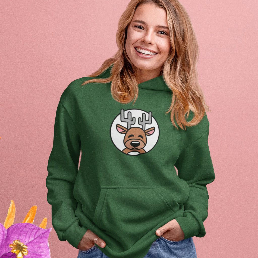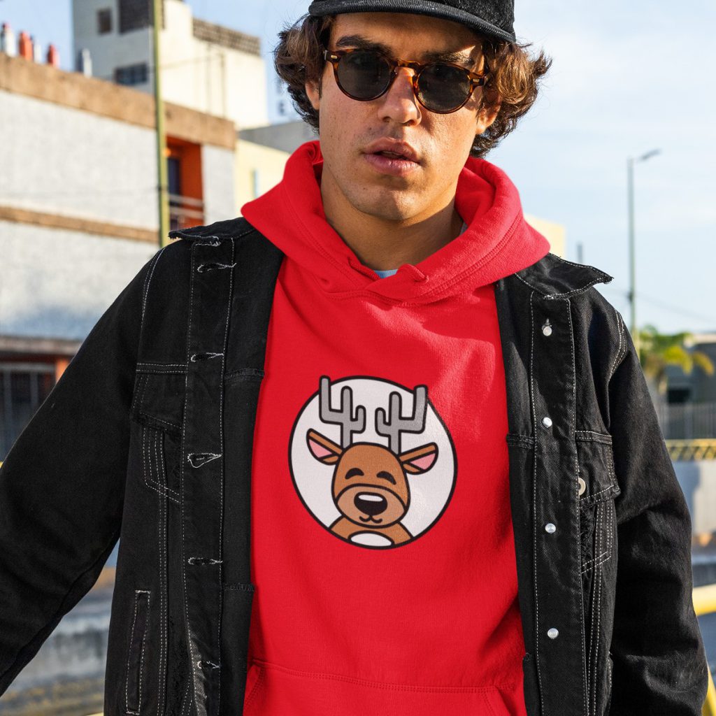Voor iedereen die van Kerstmis houdt is deze vrolijke hoodie met het rendier Rudolf. Fijne comfortabele sweater die je lekker warm houdt tijdens de koude kerstdagen. Verkrijgbaar in drie kleuren die echt bij kerst horen: groen, zwart en rood. Verkrijgbaar in de maten XS t/m 4XL, maak gebruik van de maattabel voor de juiste maat.