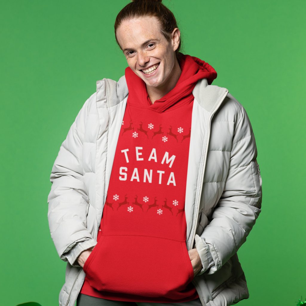 Bestel je rode kerst hoodie met rendieren en Team Santa voordelig, veilig en snel bij 1001Caps! Het is een unieke capuchon sweater die alleen verkrijgbaar is in deze shop. Daarnaast is de kersttrui zeer comfortabel en heeft het een uniseks pasvorm. Deze kleding is dan ook gemaakt voor zowel dames als heren. Verkrijgbaar in maat XS t/m 4XL.