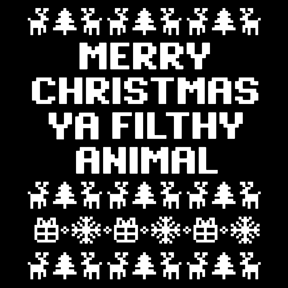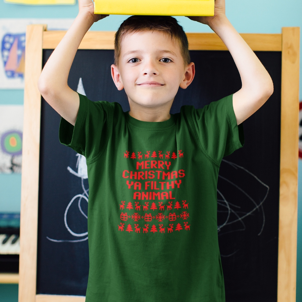 Dit grappige kerst t-shirt voor kinderen draagt de tekst Merry Christmas Ya Filthy Animal! Door het unieke design van dit Kerstmis t-shirt maakt je zoon of dochter helemaal de blits met deze outfit. Dit model is uitsluitend te bestellen bij 1001Caps en leverbaar voor kids van 1 t/m 14 jaar.
