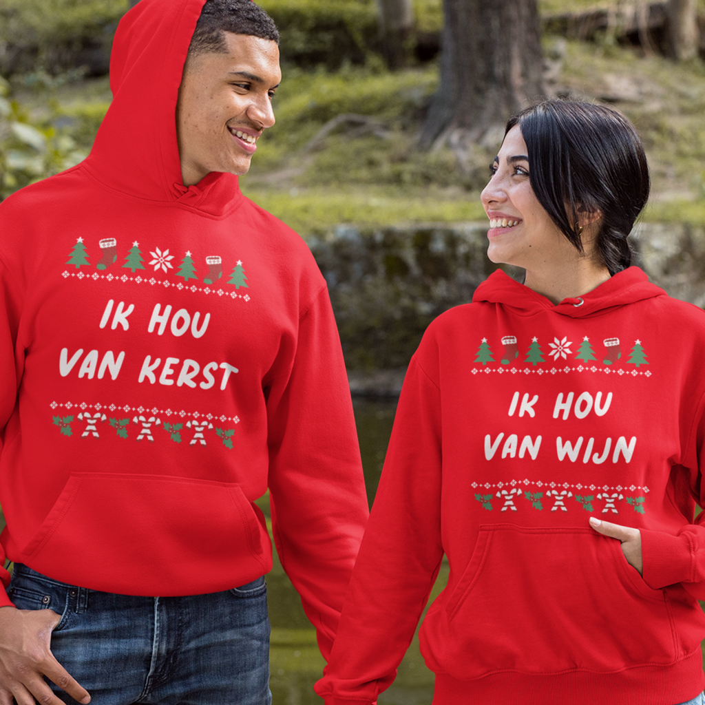 Vier kerst in stijl met onze stelletjes kersttruien! ?? Trui 1: "Ik hou van kerst" – voor de ultieme kerstfan. Trui 2: "Ik hou van wijn" – voor de wijnliefhebber. Waarom kiezen als je beide kunt hebben? Bestel snel en maak dit seizoen extra feestelijk! ? Ook verkrijgbaar zonder capuchon!