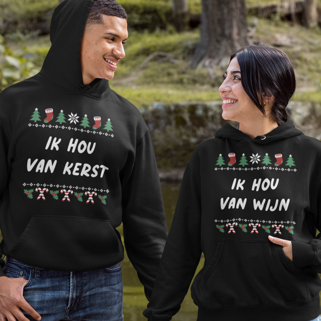 Vier kerst in stijl met onze stelletjes kersttruien! ?? Trui 1: "Ik hou van kerst" – voor de ultieme kerstfan. Trui 2: "Ik hou van wijn" – voor de wijnliefhebber. Waarom kiezen als je beide kunt hebben? Bestel snel en maak dit seizoen extra feestelijk! ? Ook verkrijgbaar zonder capuchon!