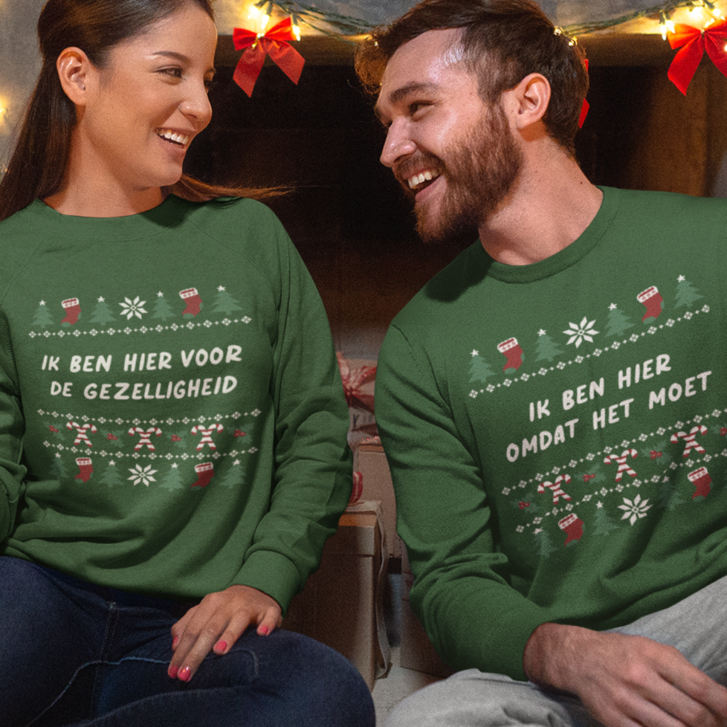 Vier kerst in stijl met onze stelletjes kersttruien! ? Trui 1: “Ik ben hier voor de gezelligheid” – Voor de sfeermaker van de avond. Trui 2: “Ik ben hier omdat het moet” – Voor degene die liever thuis was gebleven. Waarom kiezen als je beide kunt hebben? Bestel snel en maak dit seizoen extra feestelijk! ? Ook verkrijgbaar met capuchon!