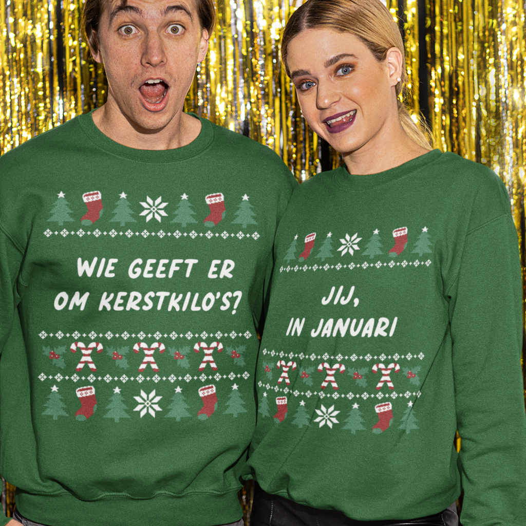 Vier kerst in stijl met onze stelletjes kersttruien! ? Trui 1: “Wie geeft er om kerstkilo’s?” – Geniet zorgeloos van al het lekkers. Trui 2: “Jij, in januari” – De perfecte comeback voor je partner. Waarom kiezen als je beide kunt hebben? Bestel snel en maak dit seizoen extra feestelijk! ? Ook verkrijgbaar met capuchon!