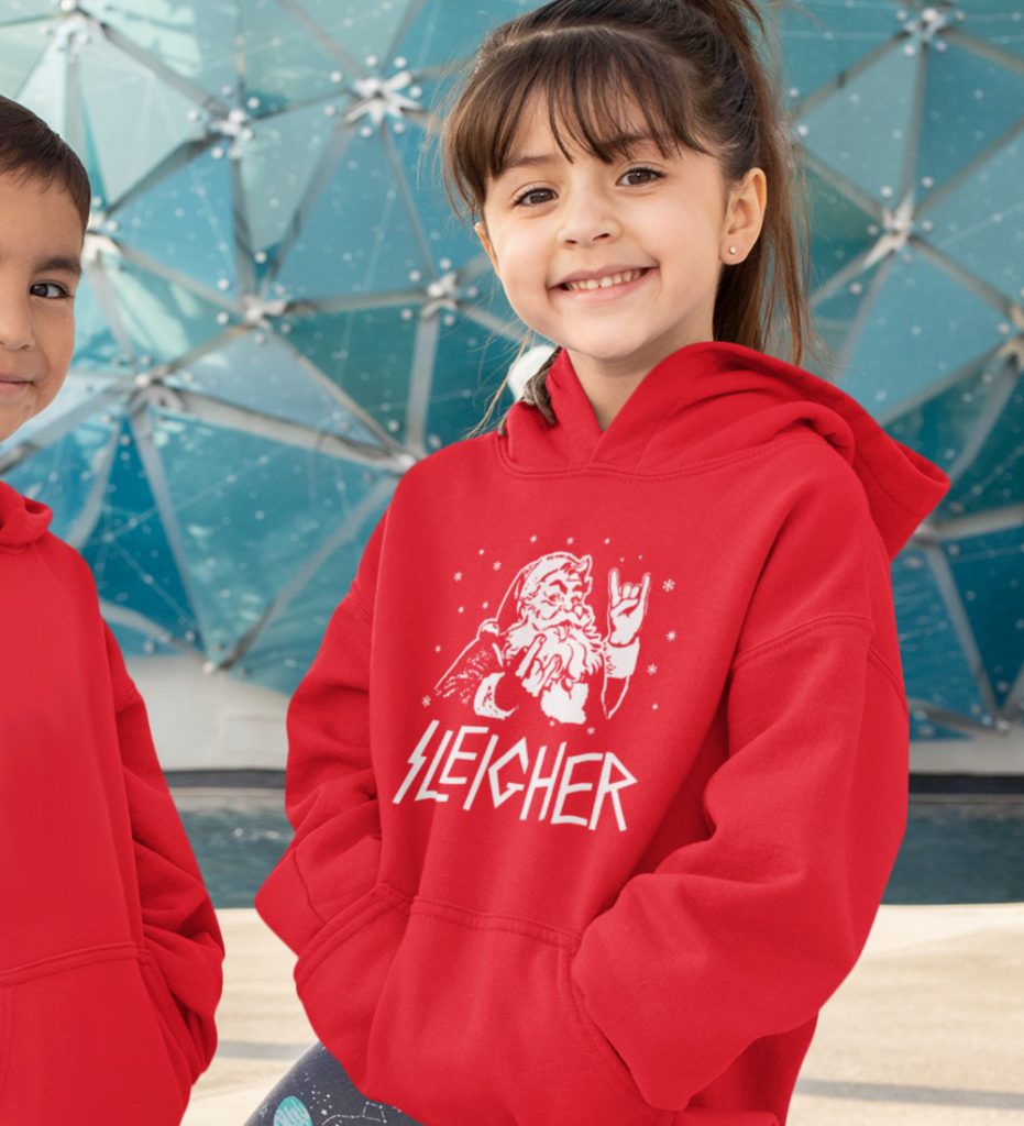 De leukste kerst hoodie voor jouw kind als je van rock of metal muziek houdt. Deze stoere hoodie met Sleigher print verkrijgbaar in de kleuren rood, groen en zwart. Bekijk de maattabel onderaan de pagina voor de juiste maat.