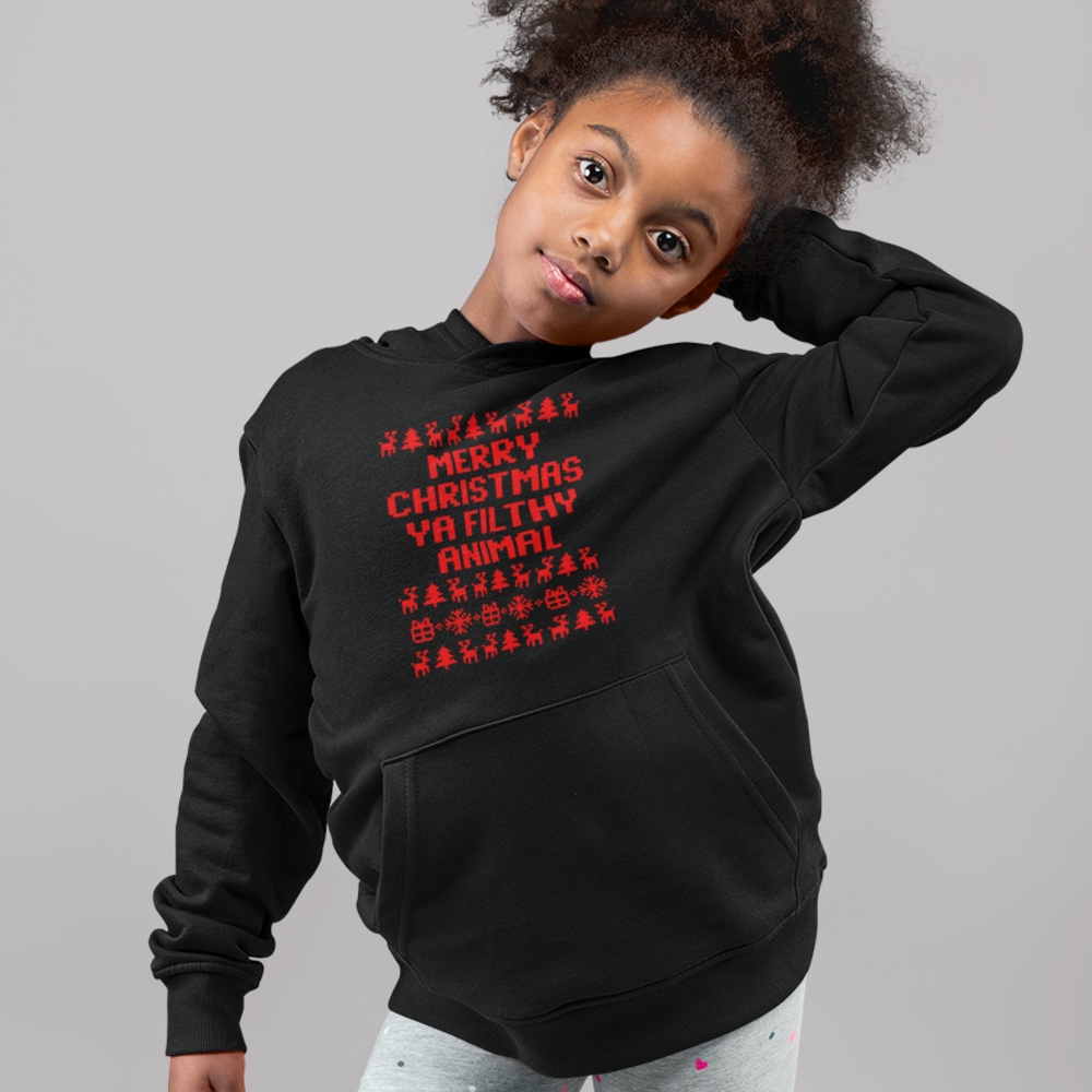 Als er bij jullie thuis best een beetje grof gesproken mag worden, dan is de 'Merry Christmas Ya Filthy Animal' kerst hoodie de ideale outfit! Als je zoon of dochter graag een beetje cheeky is, dan is dekt deze tekst de lading wel tijdens de feestdagen. Deze exclusieve, foute kerstkleding is verkrijgbaar voor kinderen van 3 t/m 14 jaar.